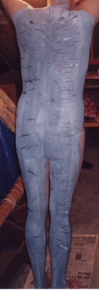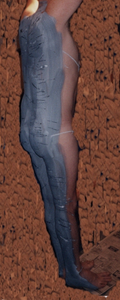 The naked model lay face down on the floor and his back was painted with a mix of diluted grey gouache mixed with a small amount of liquid soap. This grey layer was allowed to dry and then the areas of the back where blood and sweat would accumulate were overpainted with a darker grey mix. This was also allowed to dry.